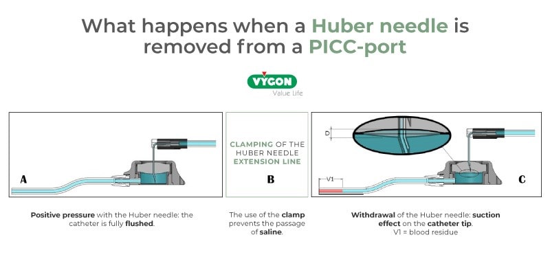 In addition to flushing with positive pressure (i.e. infusing while closing the catheter clamp and before withdrawing the needle), we must bear in mind that in the case of PICC-ports and ports in general, when the Huber needle is withdrawn, a movement of the silicone in the port is made to go with the exit of the needle.