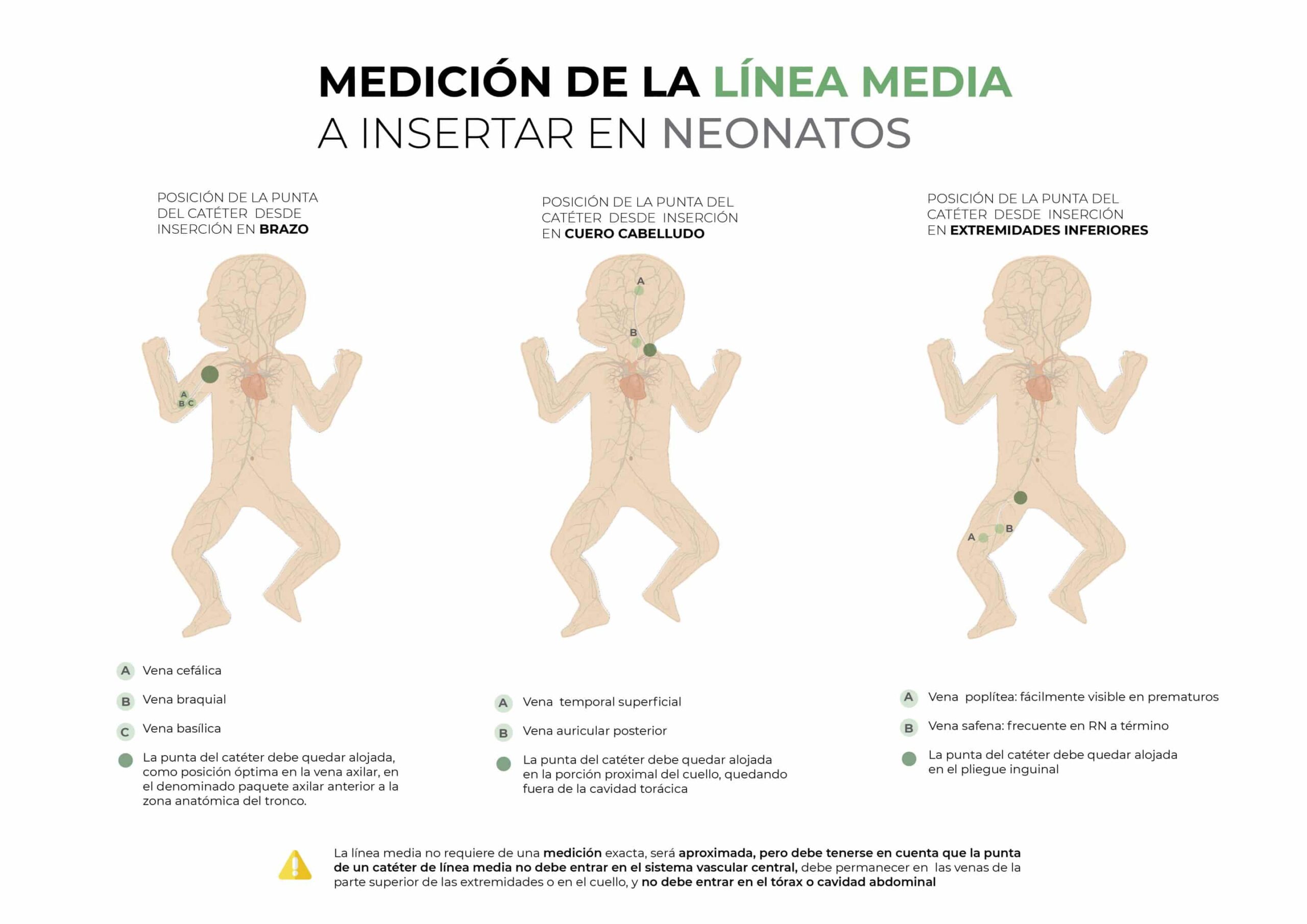 En primer lugar, se debe dar preferencia aquellas venas con mayor calibre., especialmente las situadas en miembros superiores y cabeza. La canalización de los miembros inferiores se relacionados con un mayor riesgo de complicaciones que pueden obligar a una retirada prematura del catéter. Las venas más comunes en el neonato para la canalización de líneas medias son: