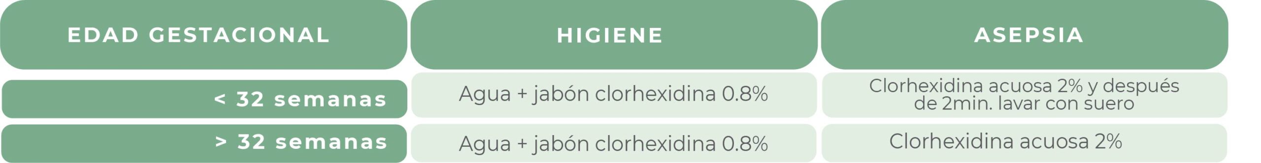 - Higiene de la piel: agua + jabón de clorhexidina al 0.8% hasta secado completo