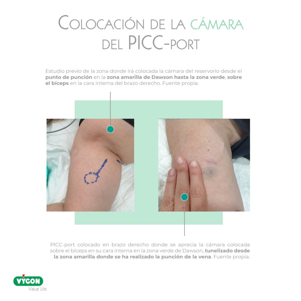 - encima del músculo bíceps, el cual actuará como una base firme sobre la que apoyará la cámara cómodamente para el paciente y para el profesional sanitario que posteriormente tenga que realizar la punción de la misma.