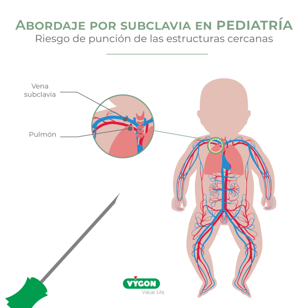 - Riesgo de punción accidental : durante la punción por vía subclavia en un paciente pediátrico, existe un riesgo de lesionar las estructuras cercanas como la pleura o el pulmón, en particular en un lactante. El PICC anula este riesgo al insertarse en el brazo.