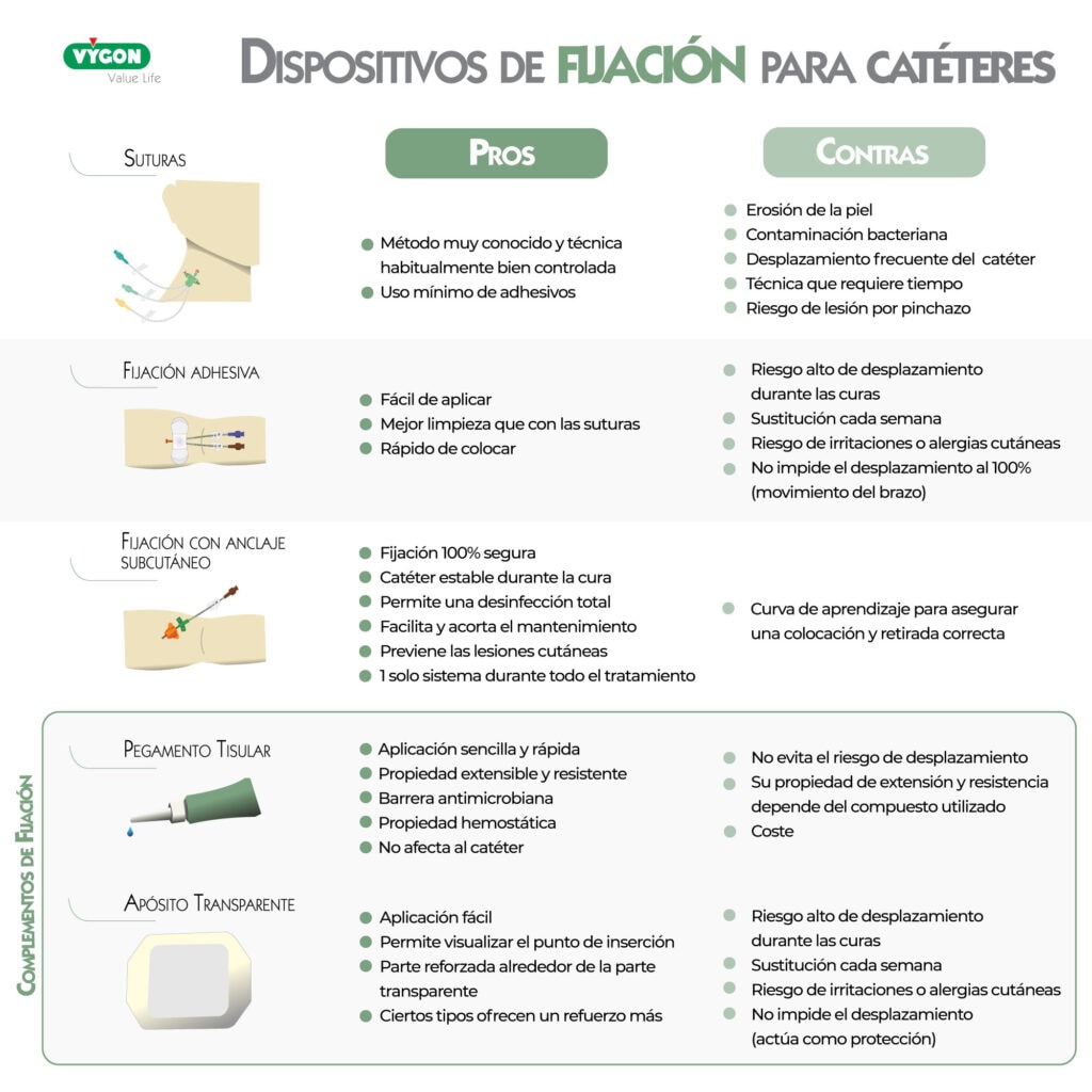 - Riesgo de desplazamiento: la zona del cuello o la parte alta del tórax hacen difíciles la fijación del dispositivo de acceso central al ser irregulares y sudorosas. Incrementa el riesgo de movimiento o de salida del catéter, riesgo inferior en el caso del PICC por estar en una zona de fijación más fácil, más protegida y con menos complicaciones vinculadas a la fijación por no estar nunca fijado por suturas.
