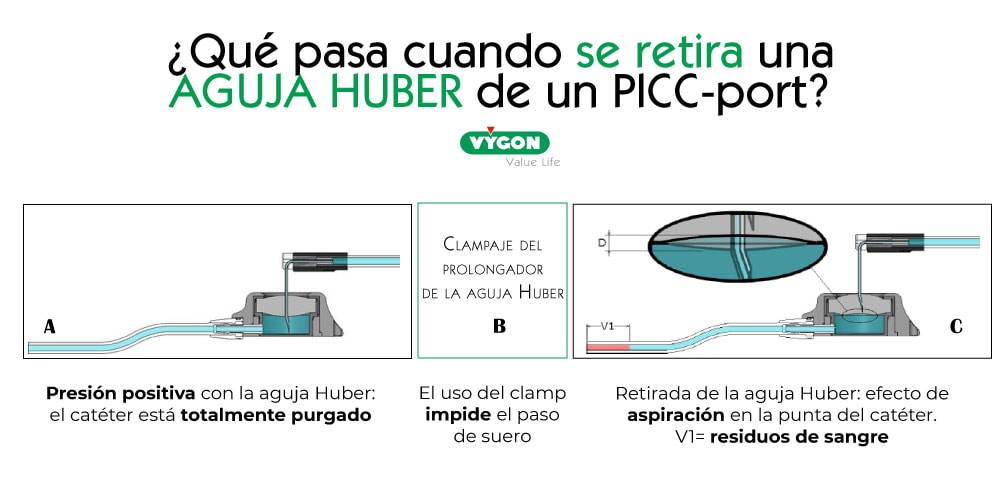 Además del lavado con presión positiva (es decir, infundiendo mientras se cierra la pinza del catéter y antes de retirar la aguja), debemos tener en cuenta en el caso de PICC-port, y de los reservorios en general, es que, al retirar la aguja de Huber, se realiza un movimiento de la silicona de la cámara acompañando la salida de la aguja.