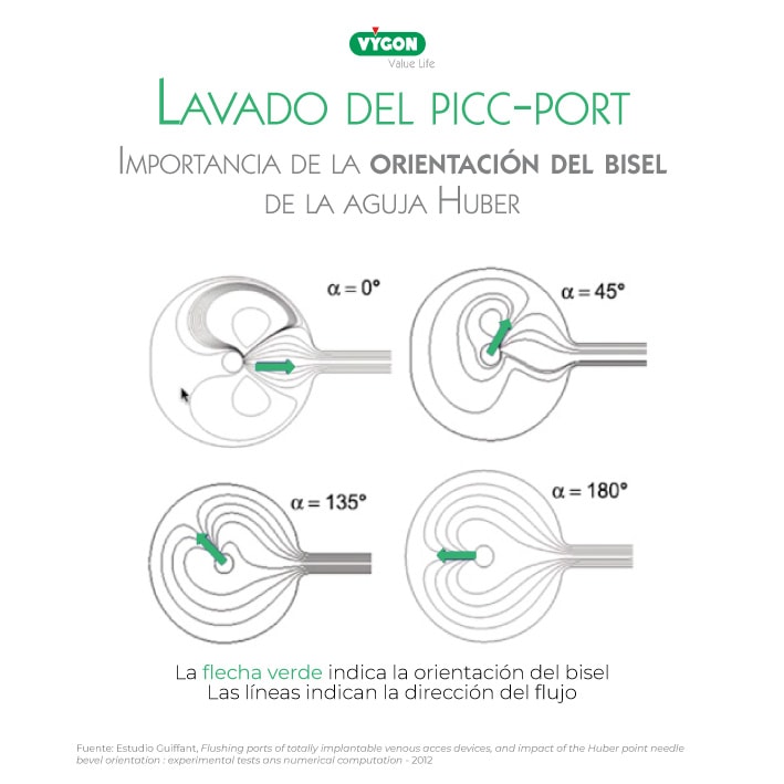 En el caso del reservorio es importante vigilar además la orientación del bisel de la aguja de Huber que, a la hora de retirarla, debería quedar enfrentada a la pared inferior de la cámara del catéter, opuesta a la conexión del catéter con la cámara, de modo que produzca un lavado circular y muy eficaz de los eventuales restos que quedaran en la cámara.