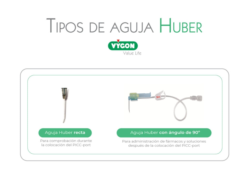 Cuando ce coloca el PICC-port, dentro del kit del mismo catéter, siempre encontraremos una aguja de Huber para comprobar el correcto funcionamiento del catéter tras su inmediata inserción. Para posteriores usos, las agujas de Huber que se encuentran en el mercado tienen un ángulo de 90º para mayor comodidad del paciente.