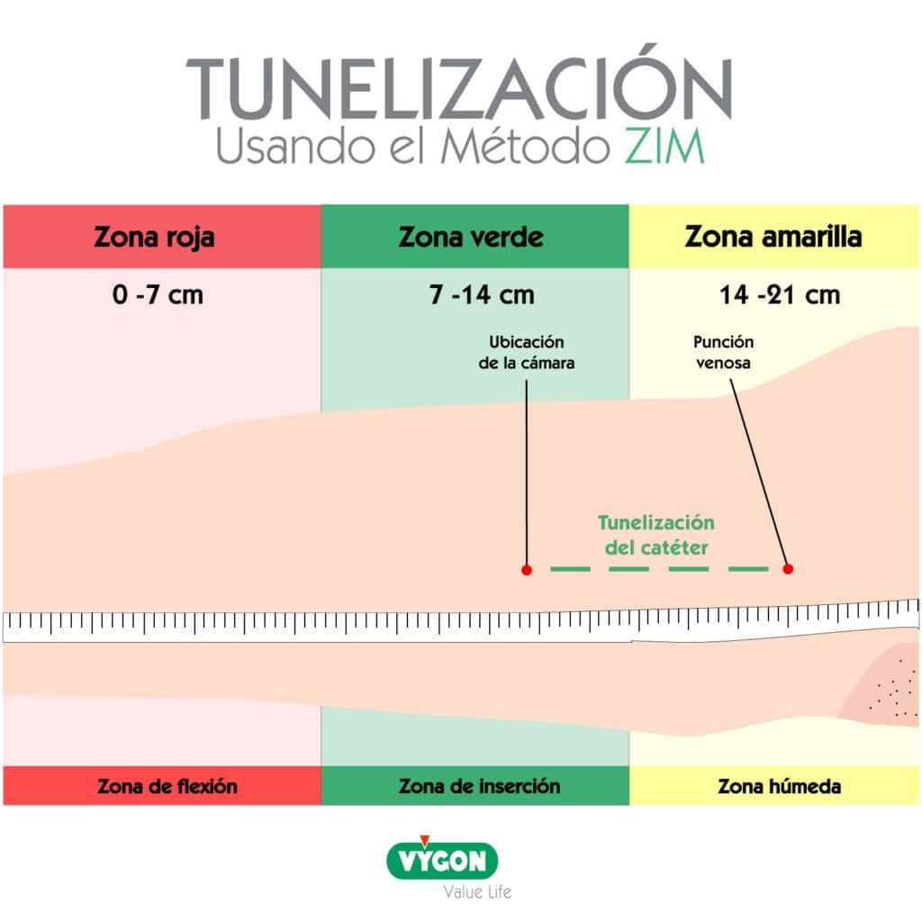 - Tunelización: desde la zona amarilla para la punción hacia la zona verde para colocar la cámara