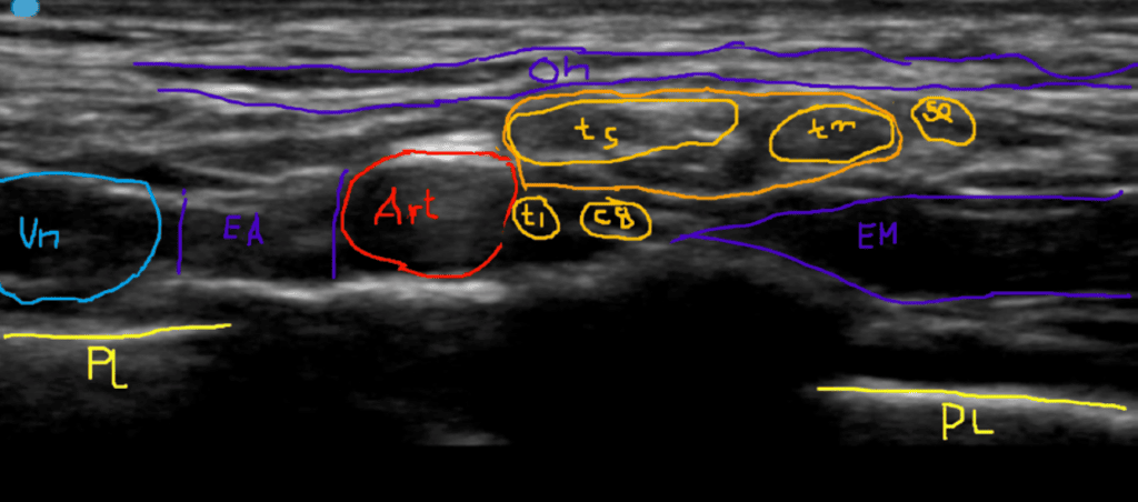 - El este paciente en particular, se observan en la cara superoexterna de la arteria, los troncos superior (TS) y medio ™ envueltos por la fascia del plexo, acompañados por el nervio supraescapular (SE). En este caso, el nervio SE está empezando a separarse del plexo.