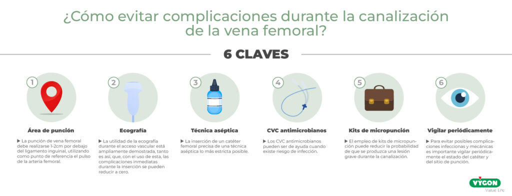 Las recomendaciones de las diferentes sociedades científicas y del proyecto Bacteriemia Zero, el cual está respaldado por la Alianza Mundial para la Seguridad del Paciente de la Organización Mundial de la Salud, la Agencia de Calidad del Ministerio de Sanidad y Consumo y la Sociedad Española de Medicina Intensiva Crítica y Unidades Coronarias, advierten que, siempre que sea posible, se debe evitar la cateterización de las venas femorales, ya que como hemos comentado, este acceso presenta más complicaciones infecciosas y mecánicas que otros accesos venosos.1