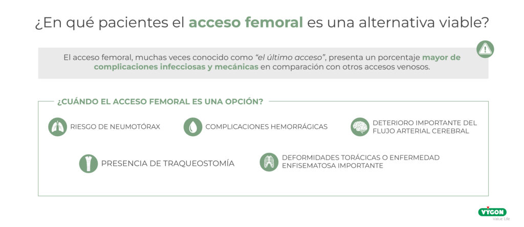 El acceso femoral, a veces conocido como “el último acceso”, presenta un porcentaje mayor de complicaciones infecciosas y mecánicas en comparación con otros accesos venosos.6 No obstante, ¿realmente hay que evitarlo en todos los escenarios?