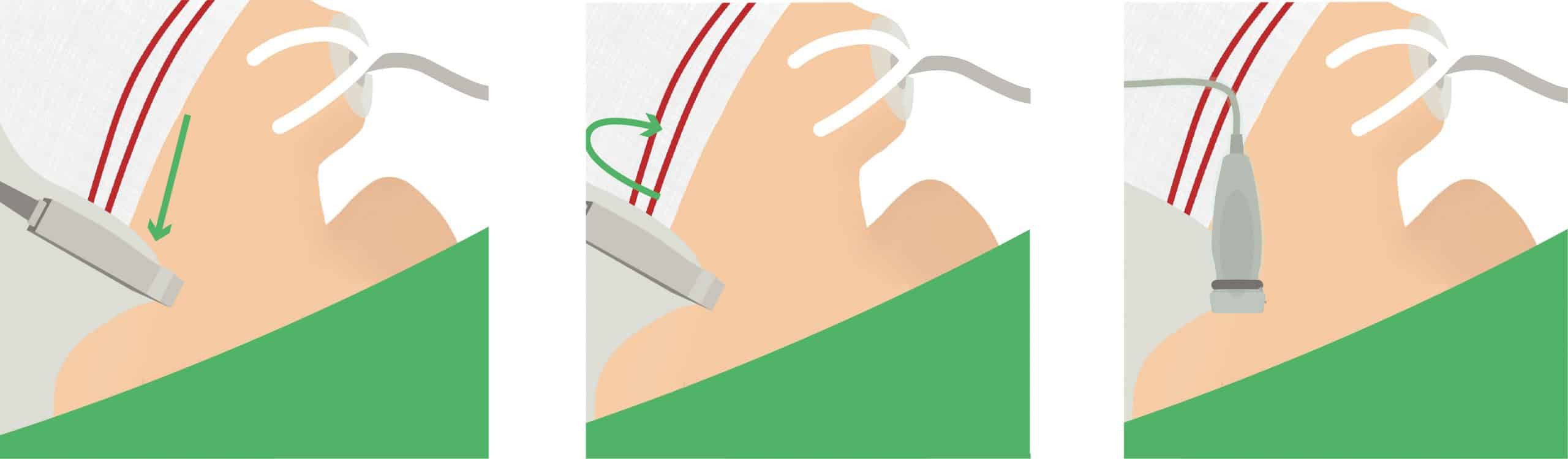 1. Con una sonda lineal (modo 2D), el operador en el lateral de la cama -si vamos a canalizar lado izquierdo- o en la cabecera -lado derecho- y el paciente con la cabeza en una posición igual a la descrita para el acceso yugular; y los brazos rectos pegados al cuerpo (puede aplicarse leve tracción si se necesita incrementar el espacio); iniciaremos la exploración desde la vena yugular en posición trasversal.