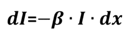 La intensidad de onda varía con el espesor del medio por el que se desplaza (dx) y el coeficiente de absorción del material que lo contiene (β).