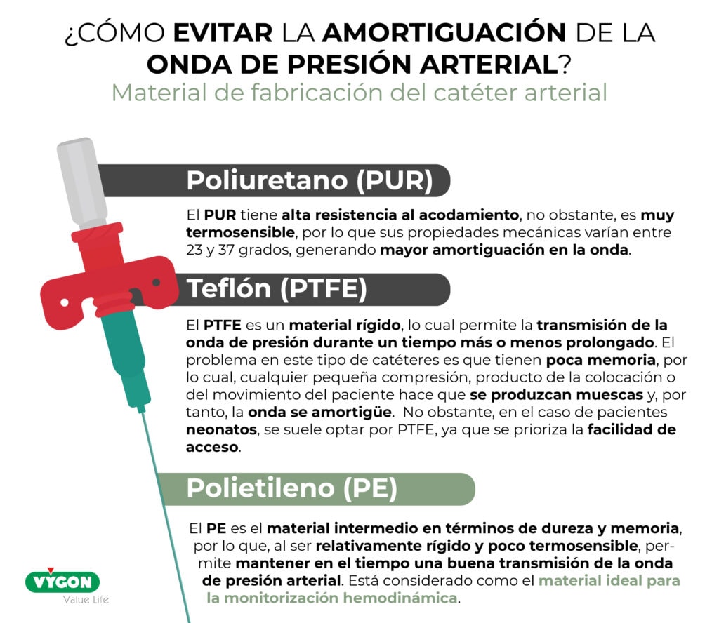 - Teflón (PTFE): al tratarse de un material rígido, permite la transmisión de la onda de presión durante un tiempo más o menos prolongado. El problema en este tipo de catéteres es que tienen poca memoria, por lo cual, cualquier pequeña compresión, producto de la colocación o del movimiento del paciente hace que se produzcan muescas y, por tanto, la onda se amortigüe.