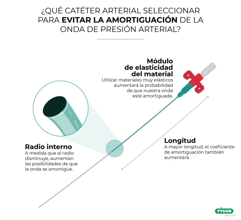 Utilizar materiales muy elásticos aumentará la probabilidad de que nuestra onda esté amortiguada. El polietileno (PE) está considerado el material ideal para la monitorización hemodinámica debido a su equilibrio entre termosensibilidad y dureza, lo cual permite mantener una onda de pulso de calidad durante mayor tiempo que poliuretano (PUR) o Teflón (PTFE).