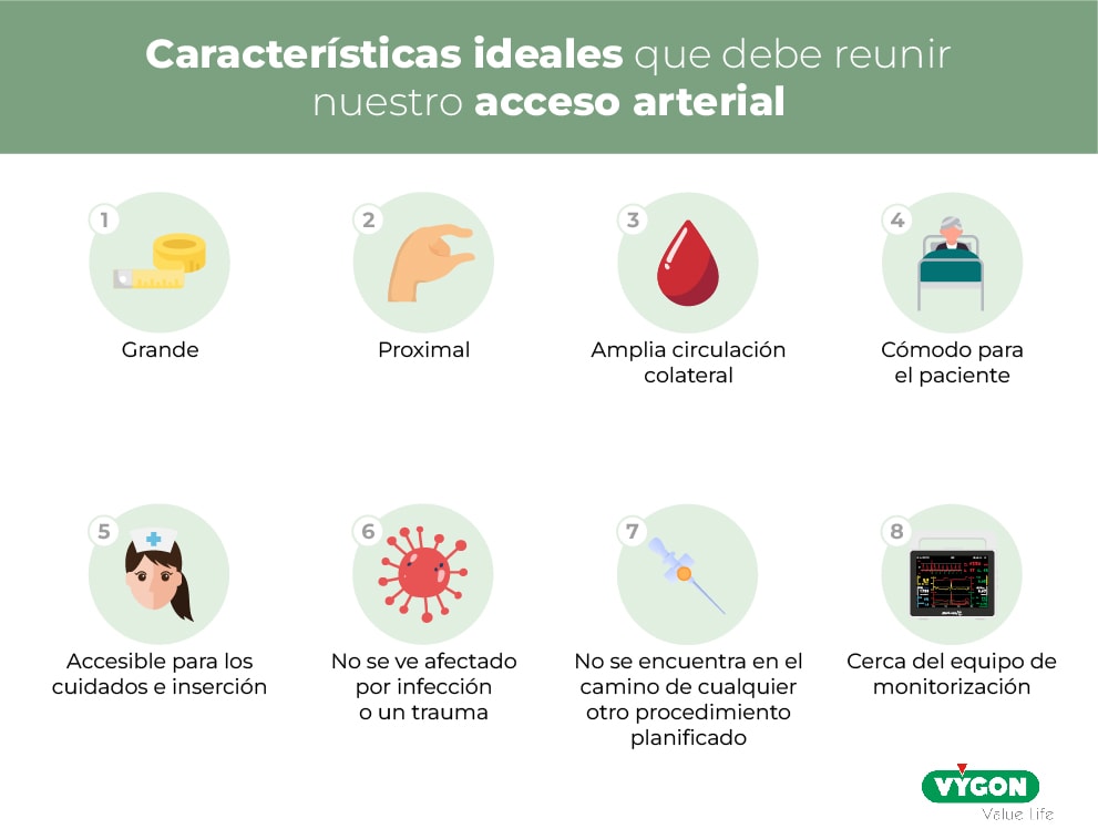 Cada acceso arterial presenta unas peculiaridades, no obstante, de forma general, las características que debe reunir el acceso arterial ideal son: