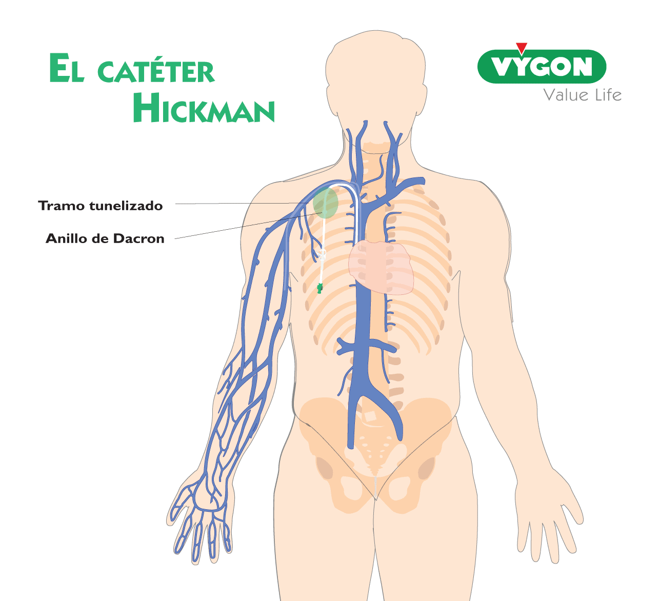 Como se ha indicado anteriormente, una parte del catéter está tunelizada bajo la piel antes de entrar en vena. La particularidad de este DAV es su anillo de Dacron que asegura una fijación duradera y fiable permitiendo un crecimiento hístico óptimo.