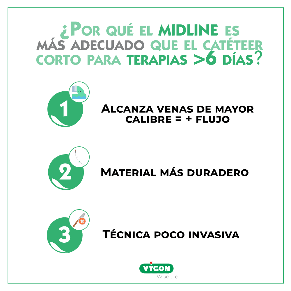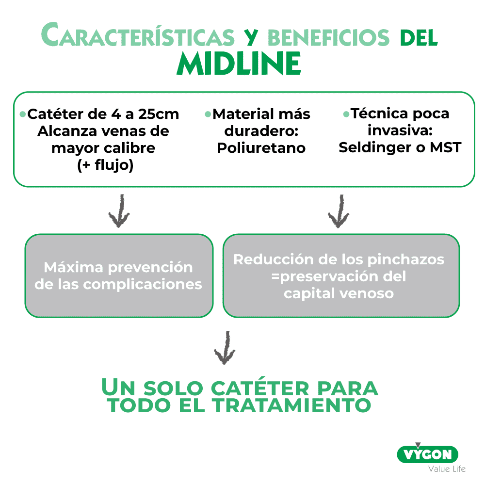 Frente a las limitaciones del catéter corto periférico, la línea media permite un acceso vascular periférico que facilita el acceso a un calibre de vena suficiente grande como para evitar las complicaciones relacionadas con una localización muy periférica de la punta del catéter (flebitis, extravasación).