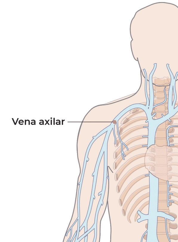 La línea media se inserta por encima de la fosa antecubital (en vena basílica o cefálica) y llega hasta la vena axilar: la punta se queda a una distancia media entre una localización periférica y una localización central.