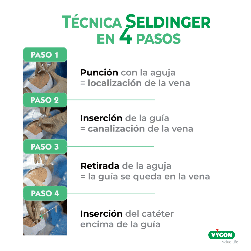 La ventaja de cualquiera de las técnicas Seldinger es que la aguja sirve solo para localizar la vena. La guía sirve para canalizar la vena y guiar el catéter. Se trata de la técnica “over the wire” = encima de la guía. Al no tener el catéter junto a la aguja, no se necesita canalizar en el momento de la punción, significa que el gesto se hace en varias etapas y de esta forma es mucho menos invasivo.