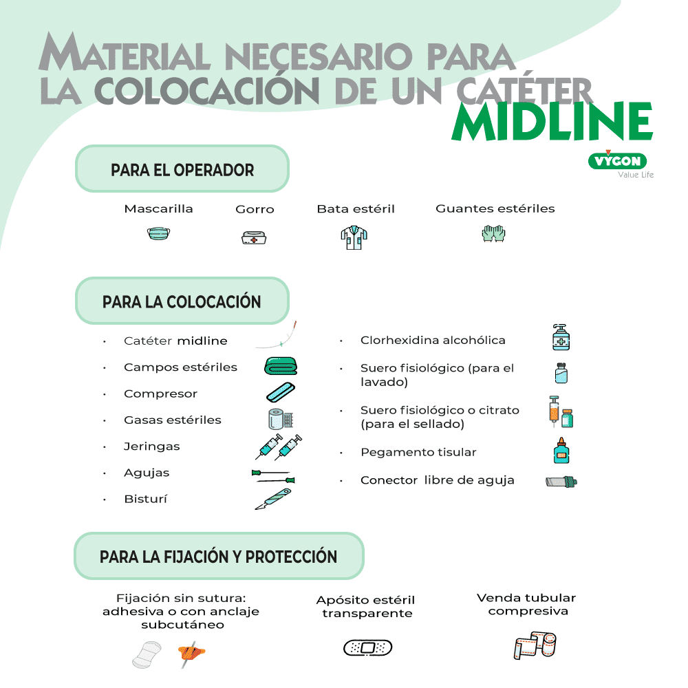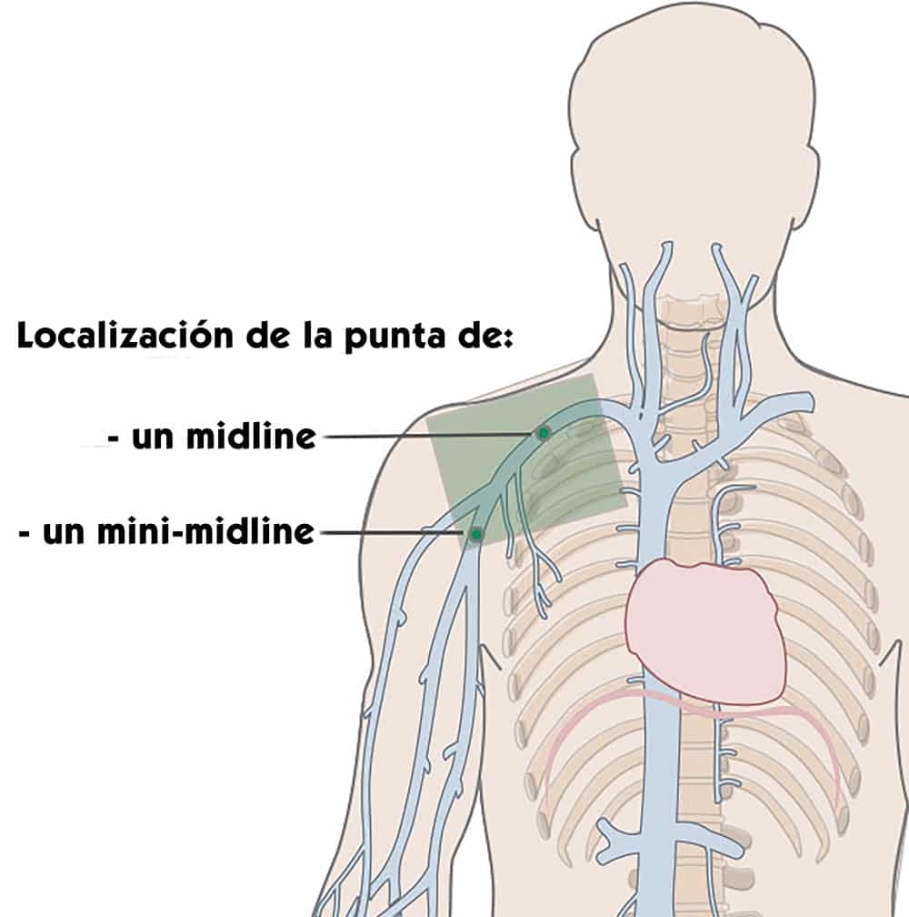 - El mini-midline: catéter de 8-10cm que se puede insertar en el antebrazo o el brazo cuya punta tiene una localización que no va más allá de la cavidad axilar.