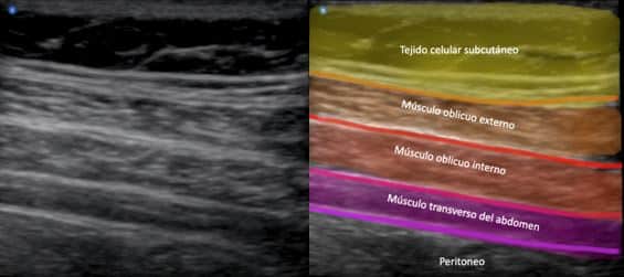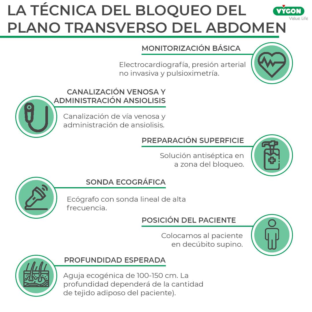 Primero, colocamos al paciente en decúbito supino o decúbito lateral. Tras las medidas de asepsia, se posiciona la sonda líneal de nuestro ecógrafo perpendicular a la línea media axilar, entre la cresta ilíaca y el reborde costal, donde identificaremos los músculos oblicuo externo, oblicuo interno, transverso abdominal y peritoneo. Posteriormente, introduciremos la aguja en plano, desde medial hacia lateral, buscando colocar la punta de la misma en la fascia ubicada entre el músculo oblicuo interno y el músculo transverso del abdomen. Localizada dicha fascia realizaremos la inyección del anestésico local.