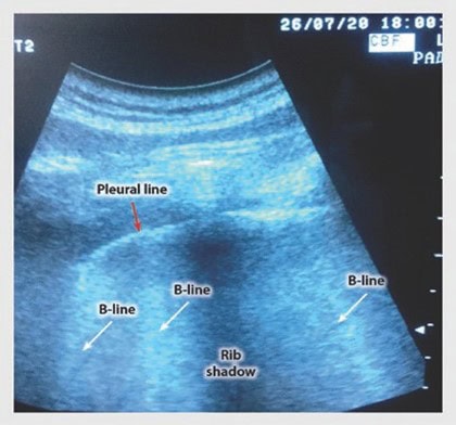 - Eco: líneas B no cuantifican el edema pulmonar, incremento de agua pulmonar extravascular. Efusiones pleurales, NT, consolidaciones pulmonares, función diafragmática (POCUS)