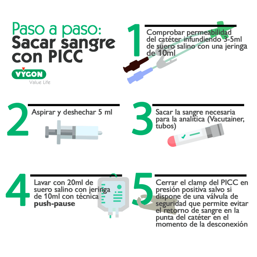 El PICC puede dejar lugar a dudas sobre la posibilidad de extracciones frecuentes por la longitud y el diámetro que tienen si lo comparamos con una vía central que es de mayor calibre y más corta. Sin embargo como lo demostraron Knue et al. en su estudio pediátrico “The Efficacy and Safety of Blood Sampling Through Peripherally Inserted Central Catheter Devices in Children”, incluso en PICC de calibre pequeño en el cual la probabilidad de obstrucción es supuestamente más elevada, la extracción de sangre es una práctica válida (4).