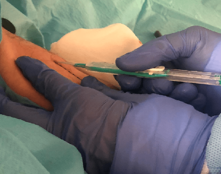 Allá que vamos. Las venas profundas de María se dejan ver con el ecógrafo. Tenemos una vena basílica de buen calibre en zona verde. ¡Podemos colocar un Midline! Entre las compañeras celebramos esta opción, la familia tiene dudas. Explicamos en detalle la técnica: indolora, de pocos minutos, con la posibilidad de poder pasar “agua y medicinas con un solo pinchazo”. Acto seguido, comprenden las ventajas y la habitación se convierte en una pequeña sala medicalizada: campo estéril, ecógrafo, cubre sonda, anestesia, máxima protecciones de barrera, … todo para una Seldinger modificada ecoguiada.