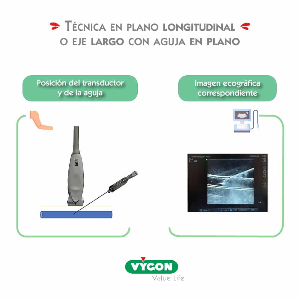 La sonda es ortogonal a la vena pero la aguja es paralela al eje principal de la sonda, como visto anteriormente.