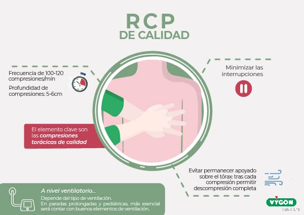 - Compresiones torácicas de calidad: son el elemento clave para realizar una buena RCP. Para ello se deben tener en cuenta dos parámetros: la frecuencia (100-120compresiones/min) y la profundidad (5-6cm) de las mismas.