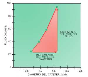 Tal como se indica en la ecuación de Hagen-Poiseuille. La influencia comparativa del diámetro y la longitud del catéter, indica que, cuando se precisa una infusión rápida de volumen. El catéter que se debería seleccionar será de gran calibre, siendo, a su vez, la elección óptima un catéter lo más corto posible.