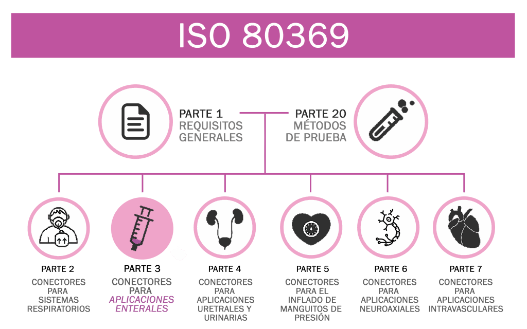 La norma ISO 80369 especifica en la parte I, requisitos generales, los diseños de conectores de calibre pequeño para líquidos y gases, exclusivo y no interconectable, para aplicaciones clínicas (2). Un marco para comparar los conectores de diferentes aplicaciones médicas con el fin de garantizar que no son interconectables entre sí y que proporciona métodos de ensayo con errores de conexión específicos.