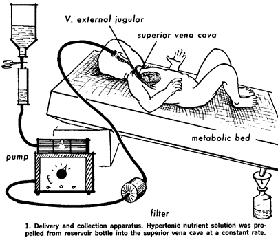 Durante los años cincuenta y sesenta, la NPT no existía. La nutrición parenteral era parcial, se administraba junto con nutrición enteral. No sería hasta 1967, cuando Dudrick, Rhoads y Vars probarían a alimentar a una manada de seis cachorros Beagle durante 255 días con Nutrición Parenteral Total.