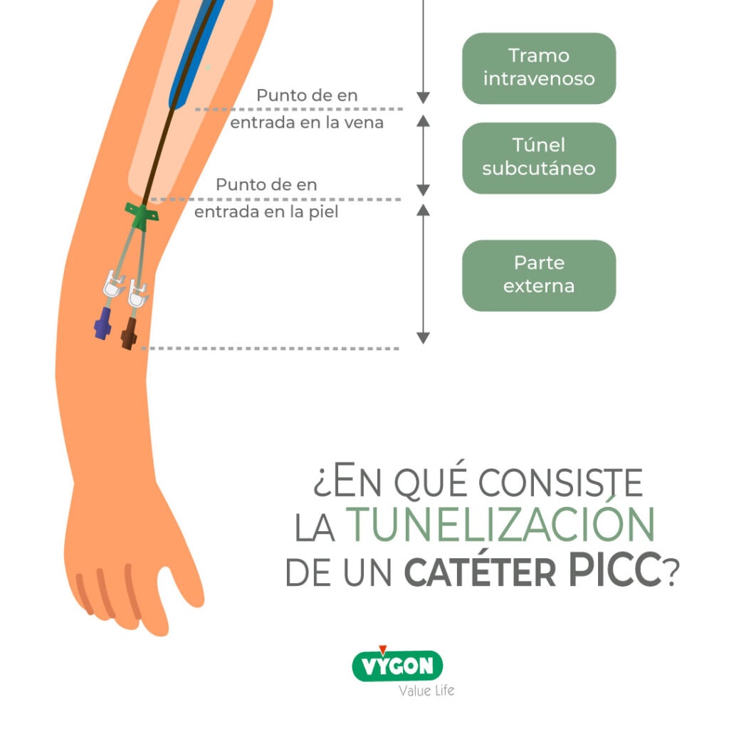 • la tunelización consiste en canalizar una vena y elegir una zona de salida del catéter distinta, haciendo que exista un túnel entre la entrada en vena y la entrada en piel