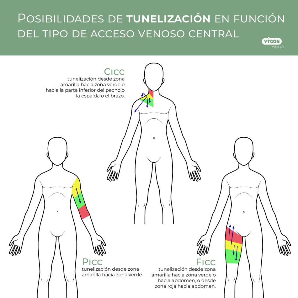 Como comentado anteriormente para poder acceder a una vena de mayor calibre y mantener la zona de salida del catéter en la zona adecuada, se puede hacer una tunelización desde la zona amarilla a la zona verde.