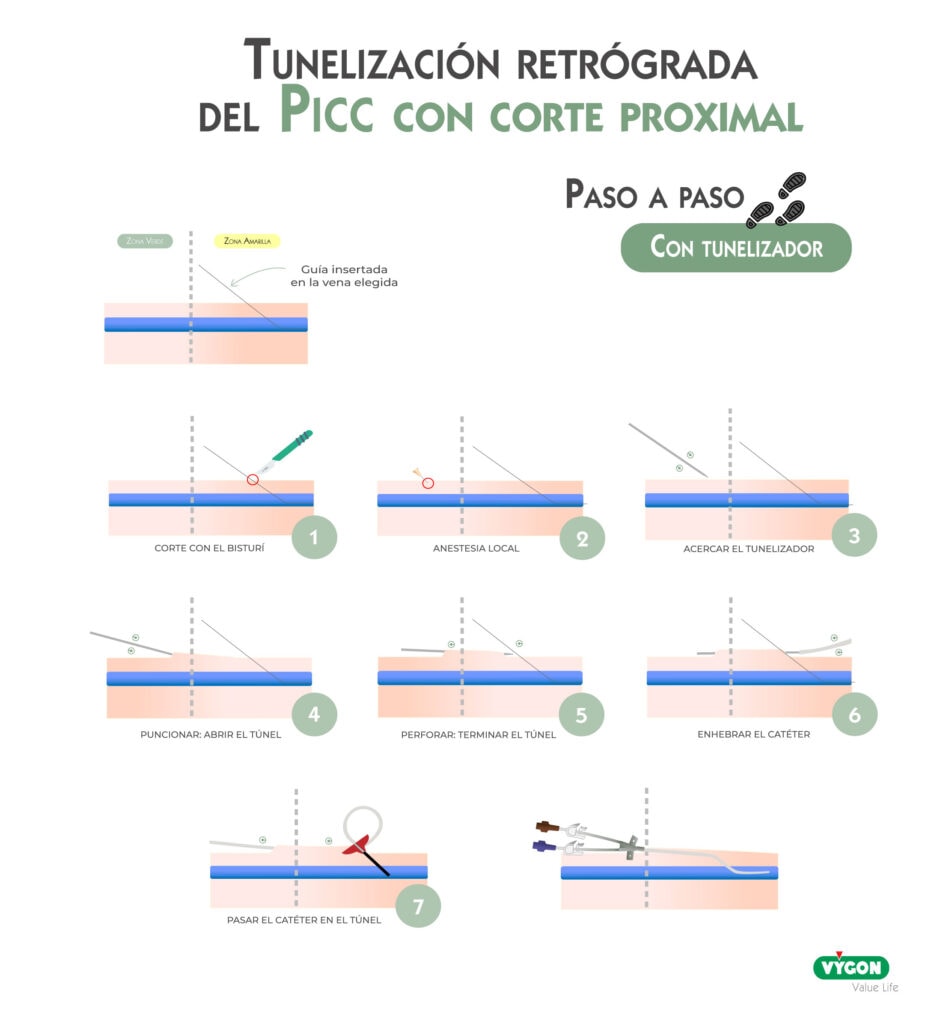 A la hora de valorar las venas de un paciente, es posible que la vena del diámetro adecuado no se encuentre en la zona ideal de punción del método ZIM (zona verde). En este contexto es necesario valorar venas de la zona amarilla y para que el catéter tenga su lugar de salida en la zona verde, se tuneliza el dispositivo.