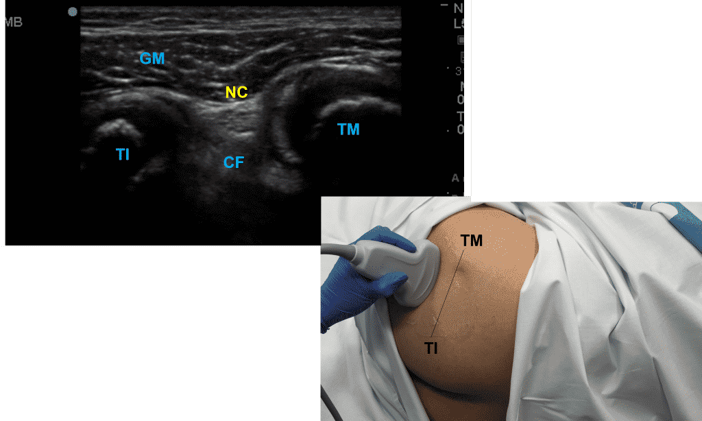 Paciente en posición de Sim que permite la localización del trocánter mayor (TM) y de la tuberosidad isquiática (TI). Colocaremos la sonda convexa en el punto medio de la línea trazada entre dichas estructuras, visualizando el nervio ciático (NC) entre ambas y en relación con los músculos glúteo mayor (GM) y cuadrado femoral (CF).
