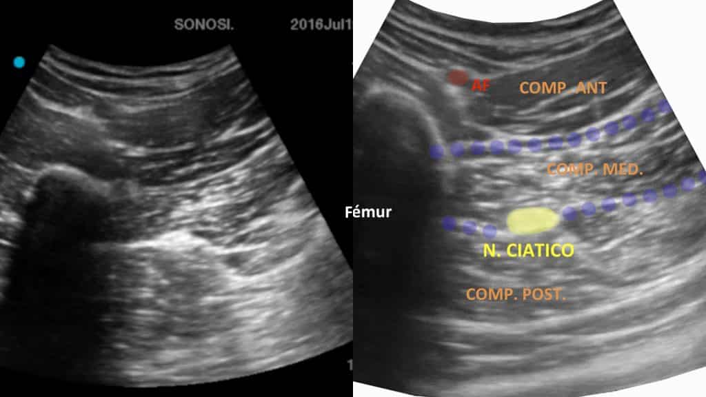 En la imagen ecográfica localizamos los vasos femorales en el compartimento anterior del muslo, el fémur y el nervio ciático entre el compartimento medio y el compartimento posterior.