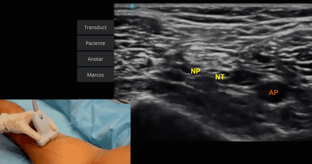 Paciente en posición de decúbito prono que permite localizar mediante una sonda lineal los dos componentes del nervio ciático, los nervios tibial (NT) y peroneo (NP), superficiales en relación a la arteria poplítea (AP).
