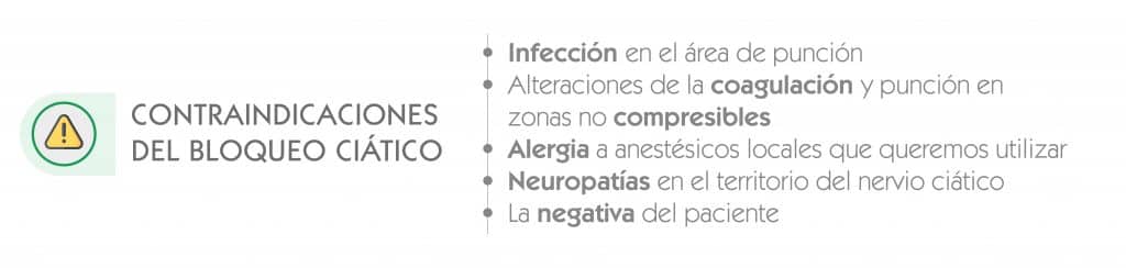 Las mismas que para la realización de otros bloqueos: infección en el área de punción, alteraciones de la coagulación y punción en zonas no compresibles, alergia a anestésicos locales que queremos utilizar, neuropatías en el territorio del nervio ciático y la negativa del paciente.