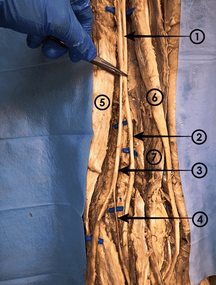RAMAS TERMINALES: Son dos: el nervio ciático poplíteo externo o peroneo común, que inerva los músculos y tegumentos de la región anteroexterna de la pierna y la región dorsal del pie, y el nervio ciático poplíteo interno o tibial, que inerva los músculos de la región posterior de la pierna, planta del pie y los tegumentos de la región plantar.