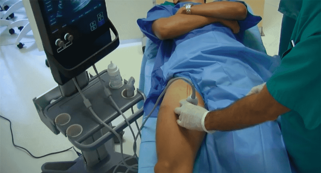 Localización ecográfica: colocaremos la sonda de ultrasonidos 8-10 centímetros por debajo del pliegue inguinal, identificando el compartimento anterior del muslo con los vasos femorales, en un nivel mas profundo encontraremos el compartimento medio con el músculo adductor mayor, y posteriormente el compartimento profundo con los músculos isquiotibiales. Entre el compartimento medio y posterior identificaremos el nervio ciático.