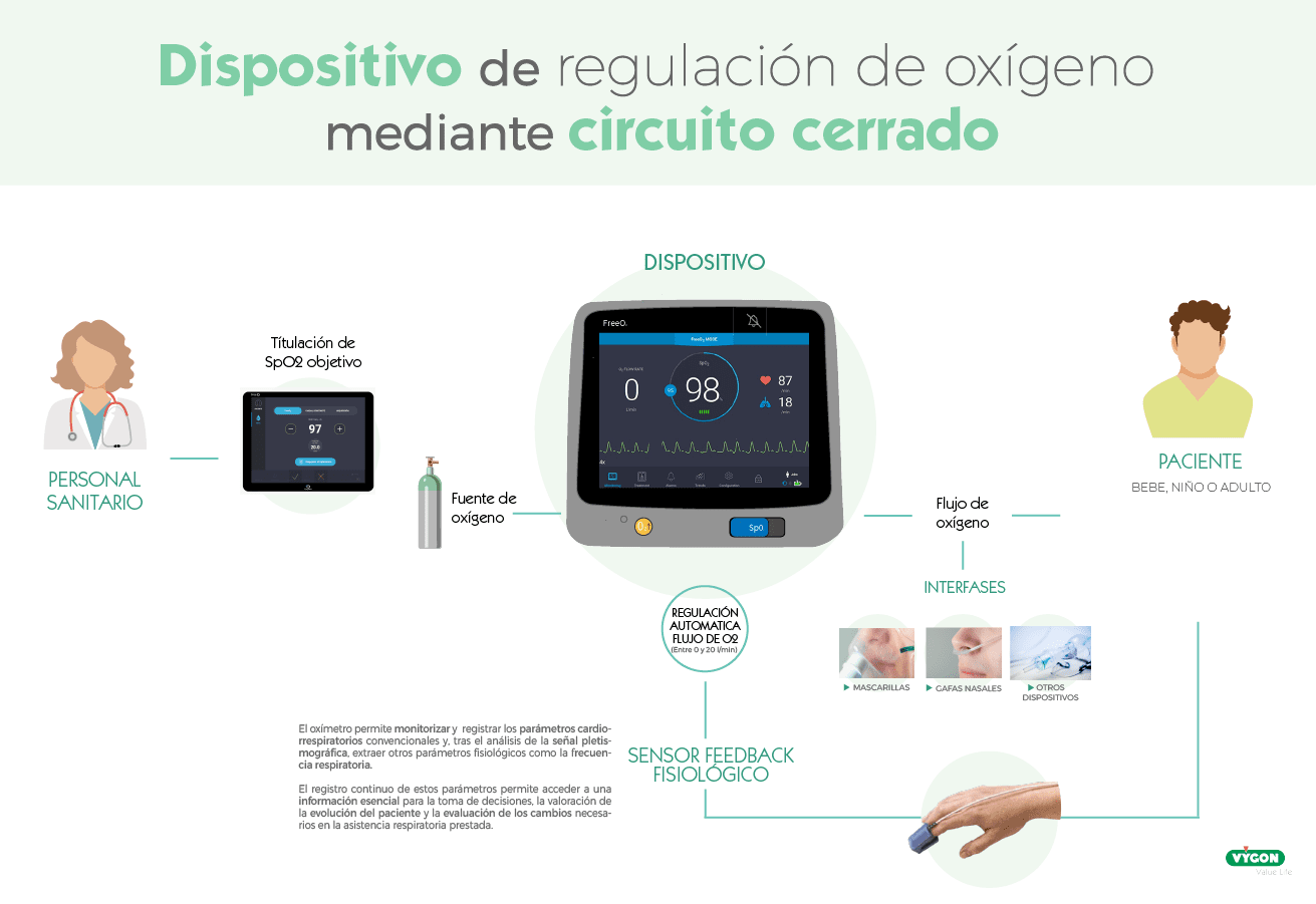 El ajuste de bucle cerrado del caudal de oxígeno es automático y la retroalimentación continua entre el objetivo de oxigenación (SO2 establecido por el médico) y la SO2 real, medida continuamente por el dispositivo. Si la SO2 medida está por encima de la SO2 objetivo, el dispositivo disminuye automáticamente el flujo de oxígeno, por el contrario, si la SO2 medida está por debajo del objetivo, el flujo de oxígeno aumenta inmediatamente.