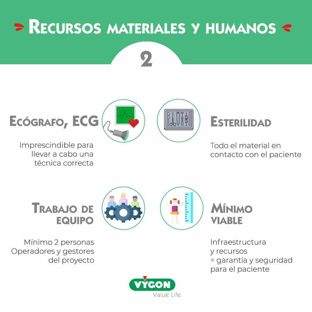 Tener unos catéteres de buena calidad, material estéril para respetar las condiciones de asepsia que requiere la técnica. Poder trabajar en una sala, un habitáculo también tiene mucha importancia tanto para hacer el procedimiento como para existir físicamente para los demás servicios.