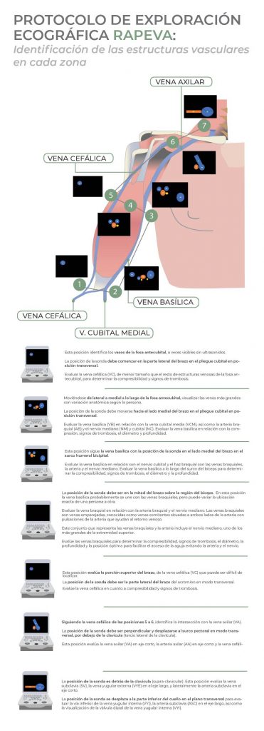 Debemos tener una experiencia básica para poder distinguir las estructuras que encontraremos en el mapeo ecográfico de los brazos, diferenciar con seguridad venas de arterias, paquete nervioso, etc para procurar evitar complicaciones. Este estudio nos permitirá elegir el tamaño adecuado del catéter respecto al diámetro de la vena, la zona con más probabilidad de éxito por localización de la vena elegida, más separada de arteria y nervios o con más calibre del trayecto, y en el caso del ingreso en domicilio, aunque puede resultar un factor menos importante, elegir la zona más cómoda para el paciente puede ser fundamental para garantizar el éxito del tratamiento.