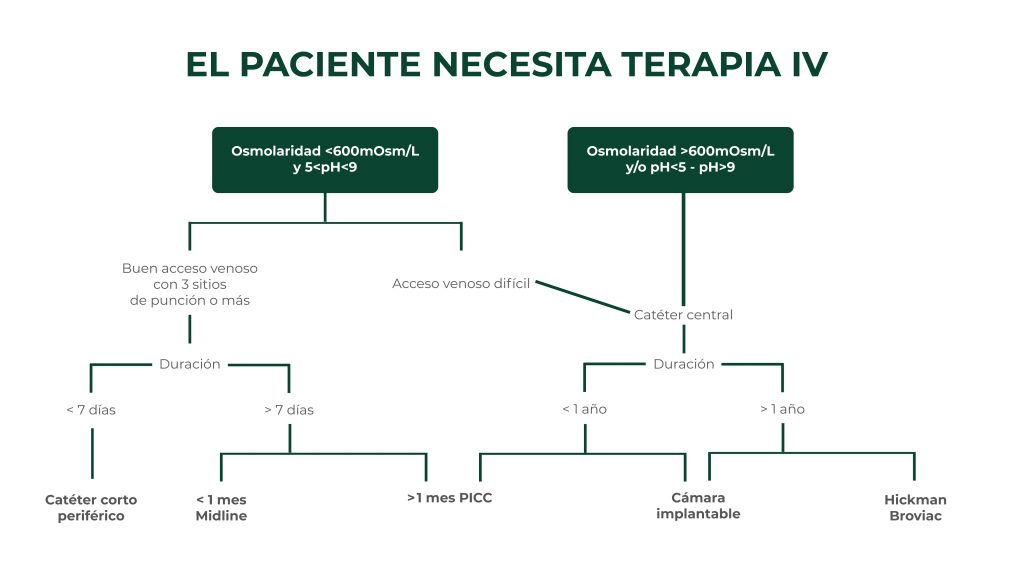 Cuando se nos plantea el ingreso de un paciente con necesidad de terapia intravenosa, lo primero que nos planteamos es determinar el acceso venoso que precisa, para ello estudiamos las características del fármaco prescrito, ph, osmolaridad, si es vesicante o no, así como la duración del tratamiento. Con toda esta información podemos decidir si puede ingresar en domicilio con un catéter periférico corto, si debemos canalizar un Midline o bien precisa un catéter central.