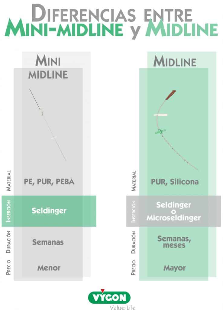 El minimidline es más corto (6 a 8 cm) que una línea media estándar (hasta 25 cm); se inserta en el antebrazo en venas palpables o con ayuda de tecnología de infrarrojos o ecografía en venas más profundas, preferiblemente. Gracias a su longitud se consigue una buena captación de flujos.