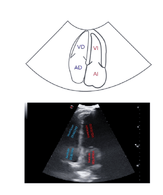 El plano apical 4 cámaras es una alternativa que requiere que el paciente se coloque en decúbito lateral izquierdo con la cabecera a 30º. Esta posición ayuda a desplazar el corazón hacia la pared torácica, minimizando la cantidad de aire entre la pared torácica y el corazón, lo que mejora su visualización. Se le llama «4 cámaras» porque en este plano se pueden visualizar ambas aurículas y los dos ventrículos del corazón.