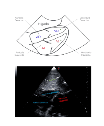 Este es el plano más sencillo. El paciente debe estar en posición supina con la cabecera ligeramente elevada. Se realiza un corte transversal en la región subxifoidea, ligeramente desplazado a la derecha del paciente, balanceando e inclinando la sonda para enfocar hacia el corazón. A pesar de que parece más lógico intentar obtener una imagen más directa del corazón desplazándose hacia la izquierda del paciente, la cámara gástrica interfiere en la visualización debido al aire presente, por lo que se emplea el hígado como «ventana» acústica.
