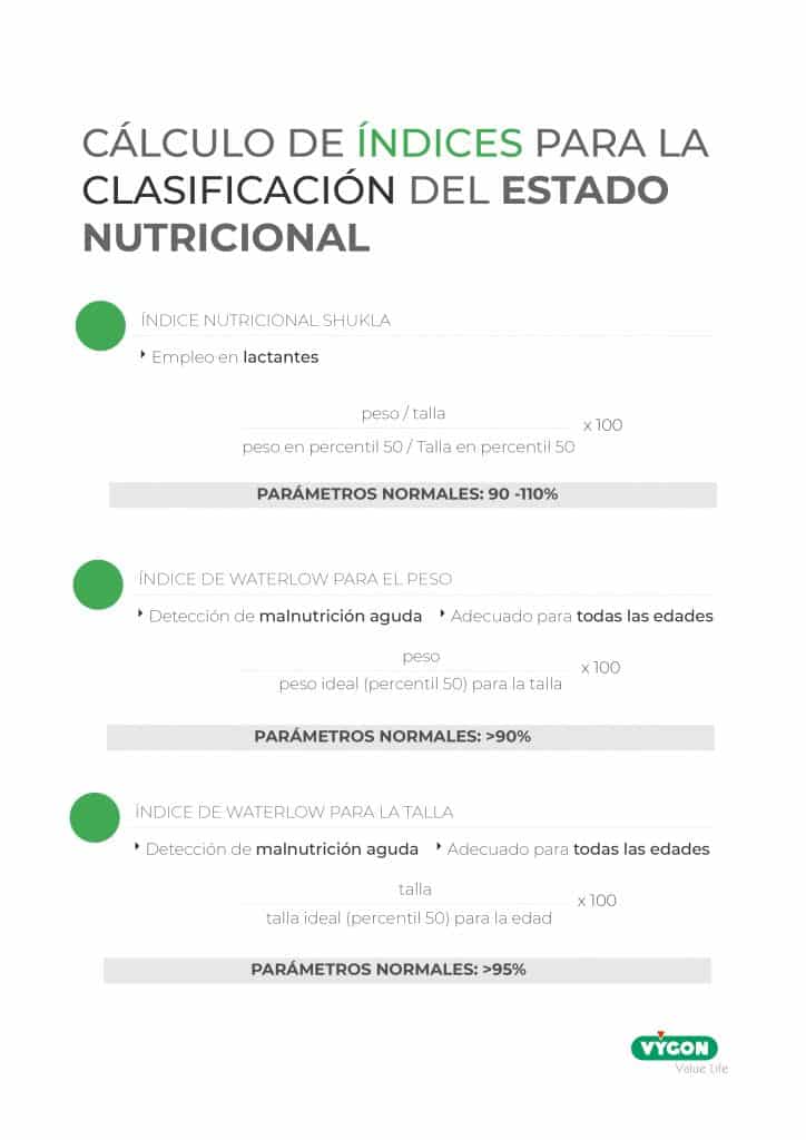 - Valoración clínica de la talla y composición corporal del neonato. Este procedimiento evaluará el peso, talla, perímetro braquial, pliegue tricipital y graso del paciente. Estos datos permitirán el cálculo de índices que ayudarán en la clasificación del estado nutricional del paciente (puedes utilizar la siguiente infografía para ello). La valoración puede completarse con el análisis de otras variables como: patrones de crecimiento, estimación del gasto energético, parámetros bioquímicos…