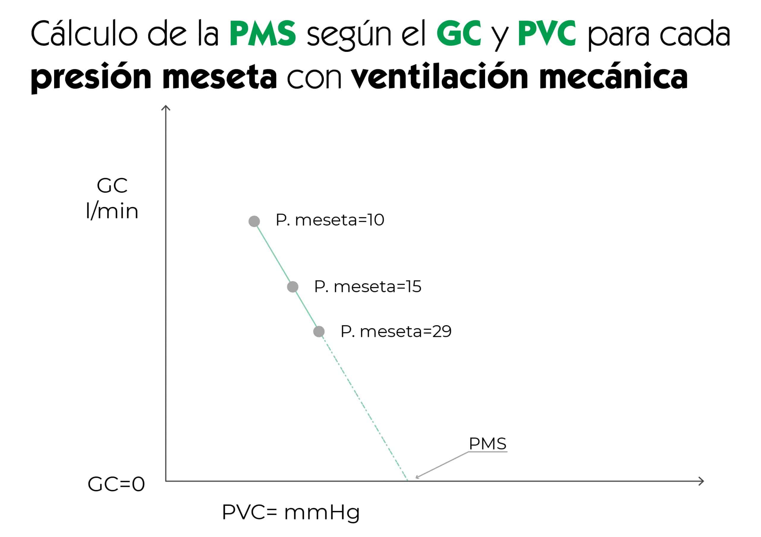 En pacientes con ventilación mecánica realizan una pausa inspiratoria de 12 segundos con presiones meseta de 5, 15, 25 y 35 cmH2O. Posteriormente, se extrapolan los resultados para un GC de 0 y se toma la medida de PVC como la PMS.